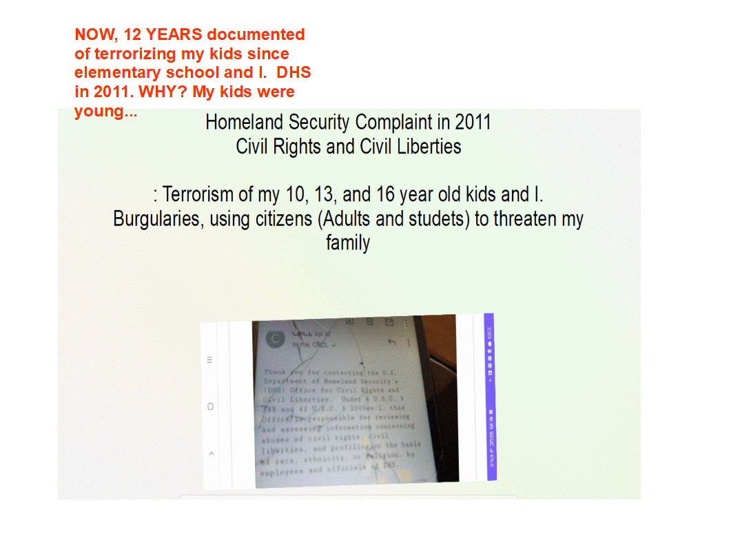Terrorized everyday, 24 hrs a day, 7 days a week for 2 since 2008/2009 to 2026 without court or due process. My kids ages: 10, 13, and 16 years old with the sinister plan to hunt and destroy each of them. The threat documented in court or police records as proof of the beginning of the terrorism. Private Investigators harassing and threatening my kids with "prison for life", unless they do as told.