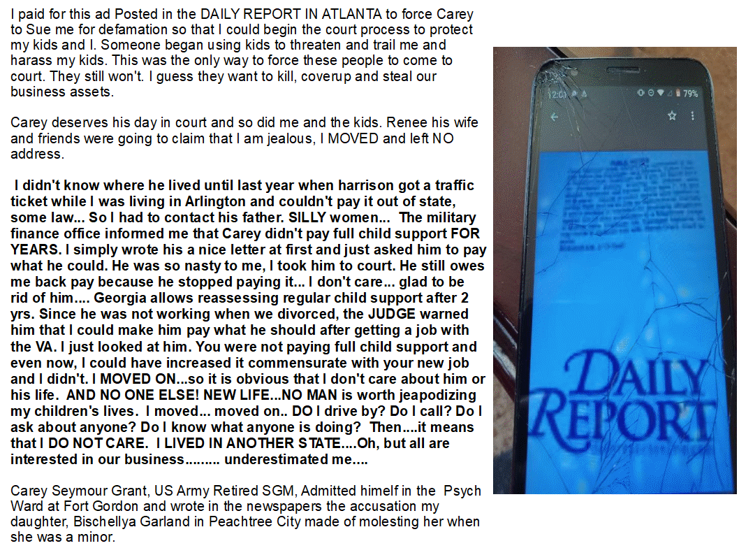 Excerpts from a lawsuit: Renee, who I had never met, Carey's wife contacted my kids on FACEBOOK through her account to talk about me. She wanted them to move in with him. The kids were all exceling at the time. We were happy.